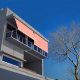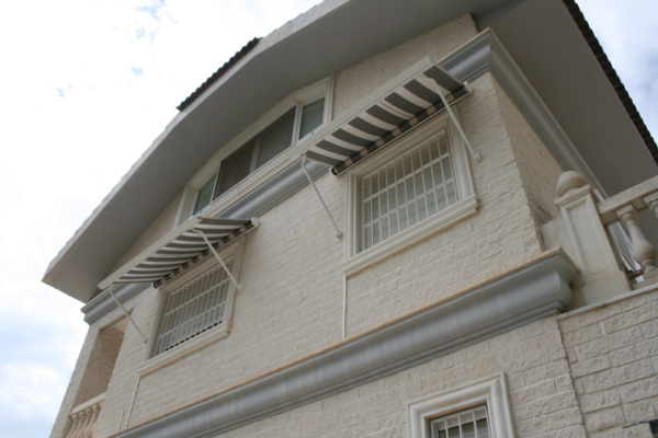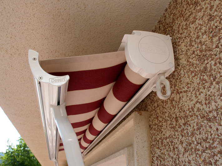 Toldo de brazos laterales pivotantes con estructura realizada íntegramente en aluminio pintado (lacado en horno y tornillería interior de acero inoxidable).